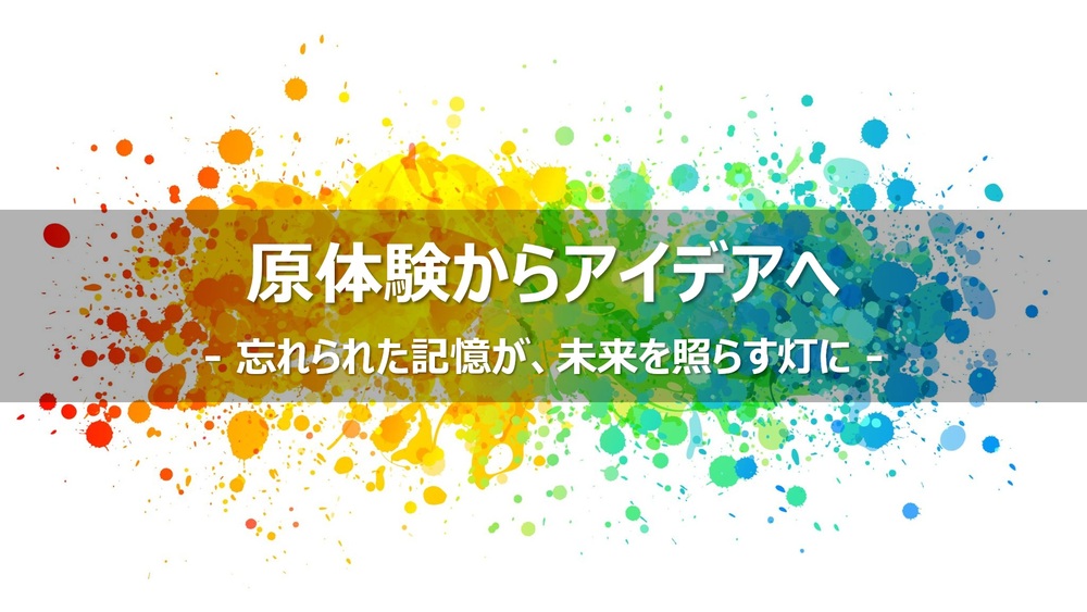 今回の講座では、原体験とは何か、どう見つけて、どうアイデアに昇華するのかを、講義と実践の両方で丁寧に紐解いていきます。本来は「原体験発見に二日間」「原体験からのアイデア創造に二日間」、合計4日かけて合宿形式で行う内容のエッセンスを極限まで凝縮いたしました。初めての方でも安心して取り組める構成です。今の自分を形づくった過去のかけらに出会い直す、そのきっかけとしてご参加ください。